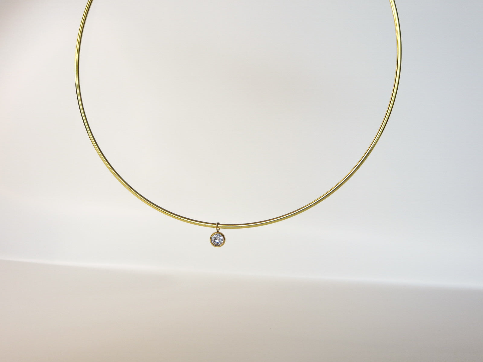 Collar sólido de acero inoxidable en tono dorado con diseño tipo gargantilla rígida y delicado dije central con zirconia brillante. Su estilo minimalista y elegante lo convierte en una pieza esencial para elevar cualquier look, desde el más casual hasta el más sofisticado.