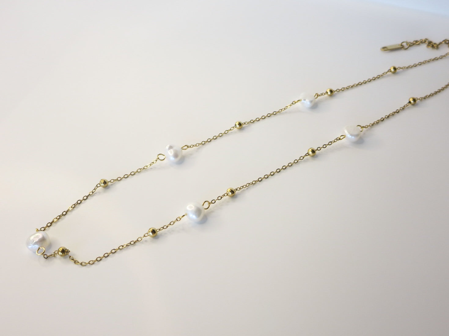Collar de acero inoxidable con delicadas perlas naturales distribuidas de manera armoniosa a lo largo de la cadena, intercaladas con pequeños detalles esféricos en acabado dorado. Su diseño ligero y refinado aporta un brillo suave y orgánico que realza el escote con naturalidad.