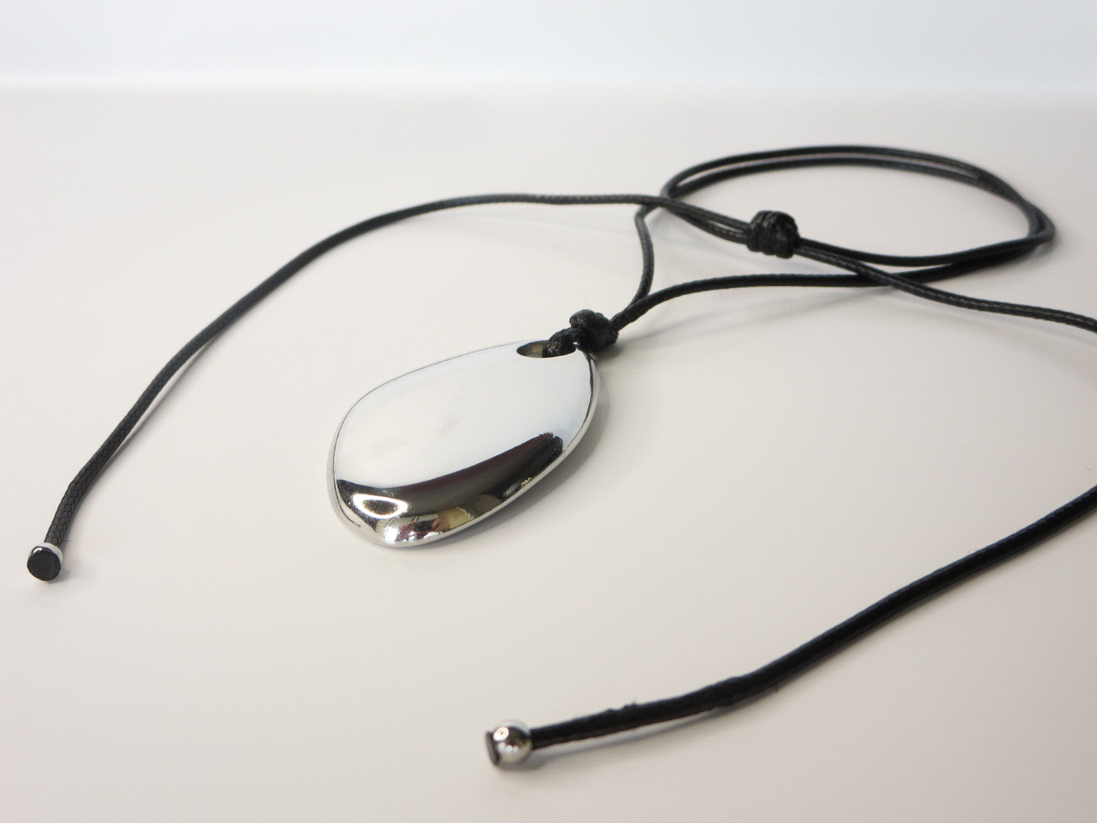 Diseño moderno y minimalista que combina elegancia y estilo. Este collar presenta un colgante orgánico en acero inoxidable pulido que refleja la luz con un acabado espejo, acompañado de una cordón negro ajustable que permite adaptarlo a diferentes largos.