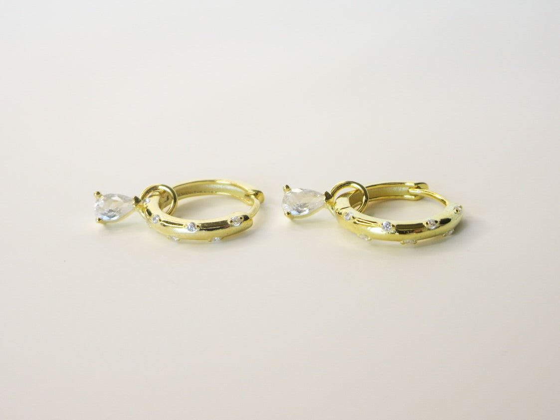Aretes tipo argolla elaborados en plata 925 con baño de oro de 18k, adornados con zirconias incrustadas que aportan un brillo delicado y elegante. Cada argolla incluye un dije en forma de gota con zirconia corte pera, creando un movimiento sutil y luminoso. Un diseño femenino, moderno y perfecto para elevar cualquier look del día a día o para ocasiones especiales.