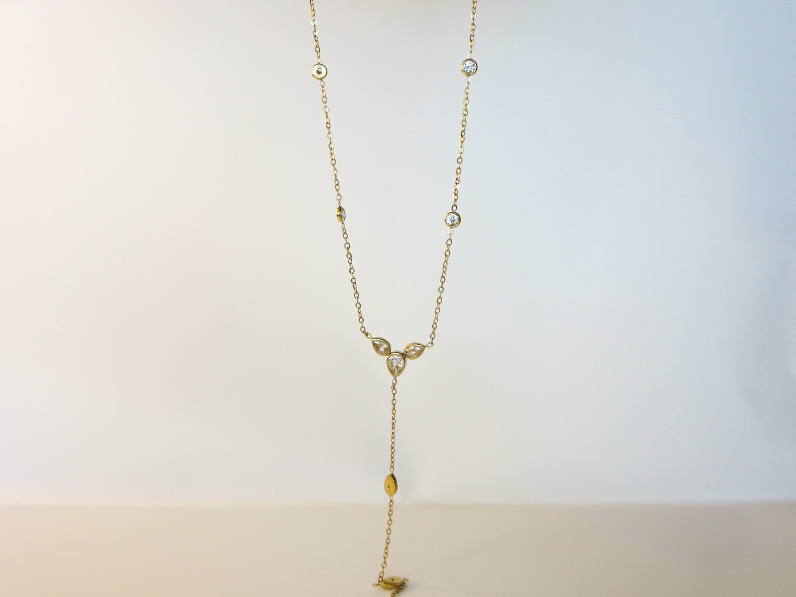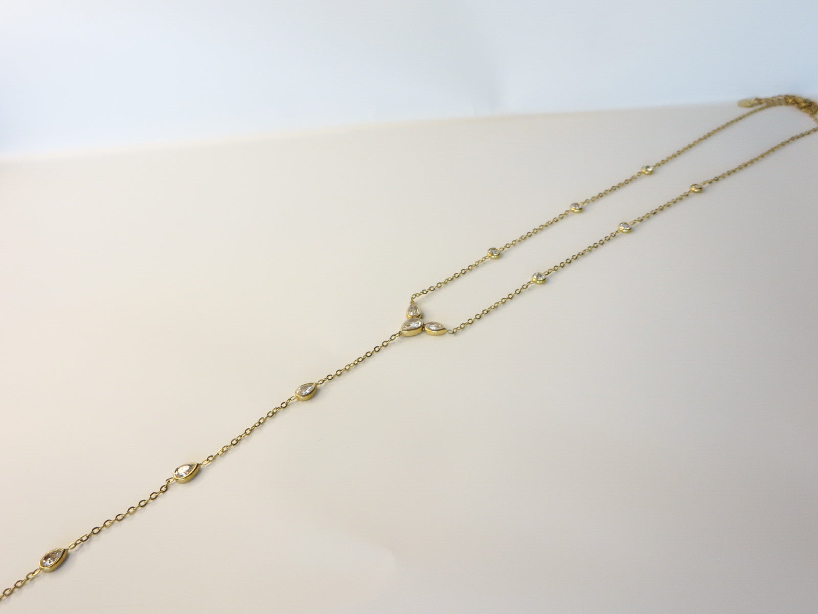 Collar elaborado en acero inoxidable, con una delicada cadena adornada con zirconias tipo gota y redondas distribuidas a lo largo del diseño, creando un brillo sutil y femenino. Su composición ligera y equilibrada lo convierte en una pieza ideal para usar sola o en layering con otros collares.