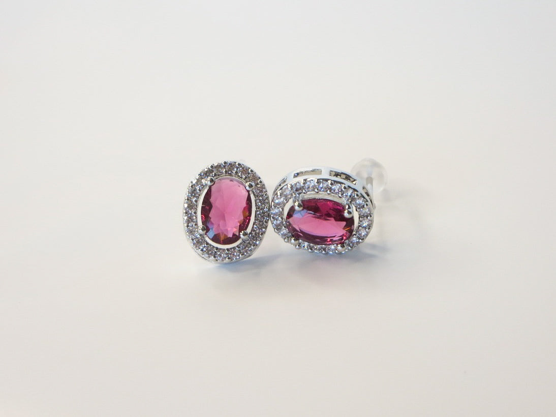 Aretes de acero inoxidable con diseño clásico y sofisticado, protagonizados por una piedra central en tono rosa de corte ovalado que aporta un brillo profundo y femenino. La piedra está enmarcada por un delicado halo de zirconias blancas que realzan su luminosidad y crean un efecto elegante y atemporal.